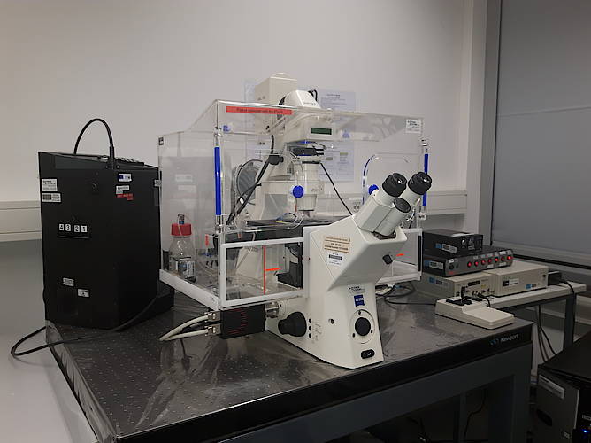 Our Zeiss Axiovert 200 4D-System is designed for rapid acquisition LiveCell imaging in XYZ. The incubator allows control on temperature and CO2, and the motorized stage allows multiple-position imaging. Objectives can be mounted on a piezo for very fast z-acquisition.