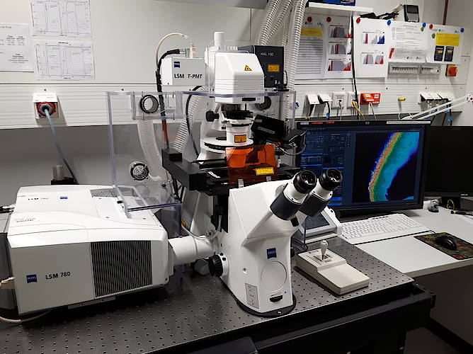 It is an inverted Laser Scanning Confocal microscope with up to 32 spectral detection channels, 2 PMTs and one transmission channel. It provides FLIM functionality.