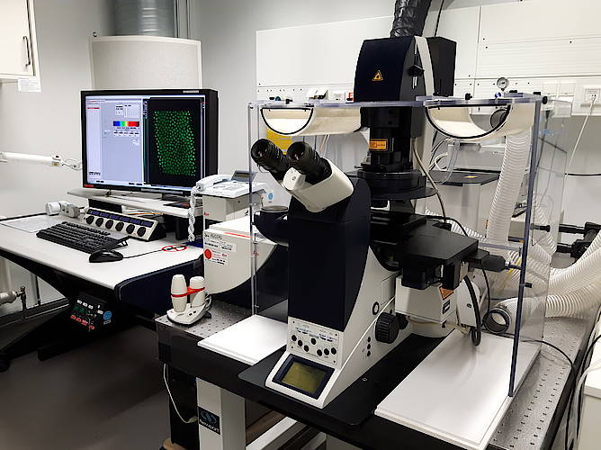 A Mai Tai IR laser allows the use of mutli-photon imaging, for thick or sensitive samples, or UV-excitable dyes.
