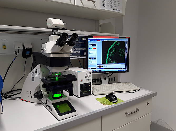 Our Leica videomicroscope upright is designed for routine work on fixed sample. Both fluorescent samples and stained histological samples can be imaged due to the color acquisition function of the camera.