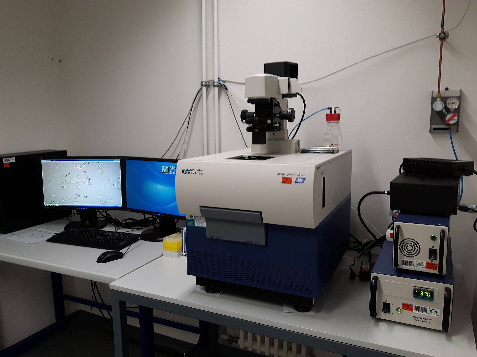 t is a high-content fast widefield screening microscope capable of automated imaging of fluorescence, transmitted light and phase contrast with a large field of view. It supplies a laser-based autofocus and provides an environmental control (T, CO2, humidity) unit. Thus it is suitable for fixed as well as for live cell imaging. The stage can be moved with 100 nm precision in x, y, and z direction. An universal plate holder provides flexibility from slides up to 1536 well plates.
