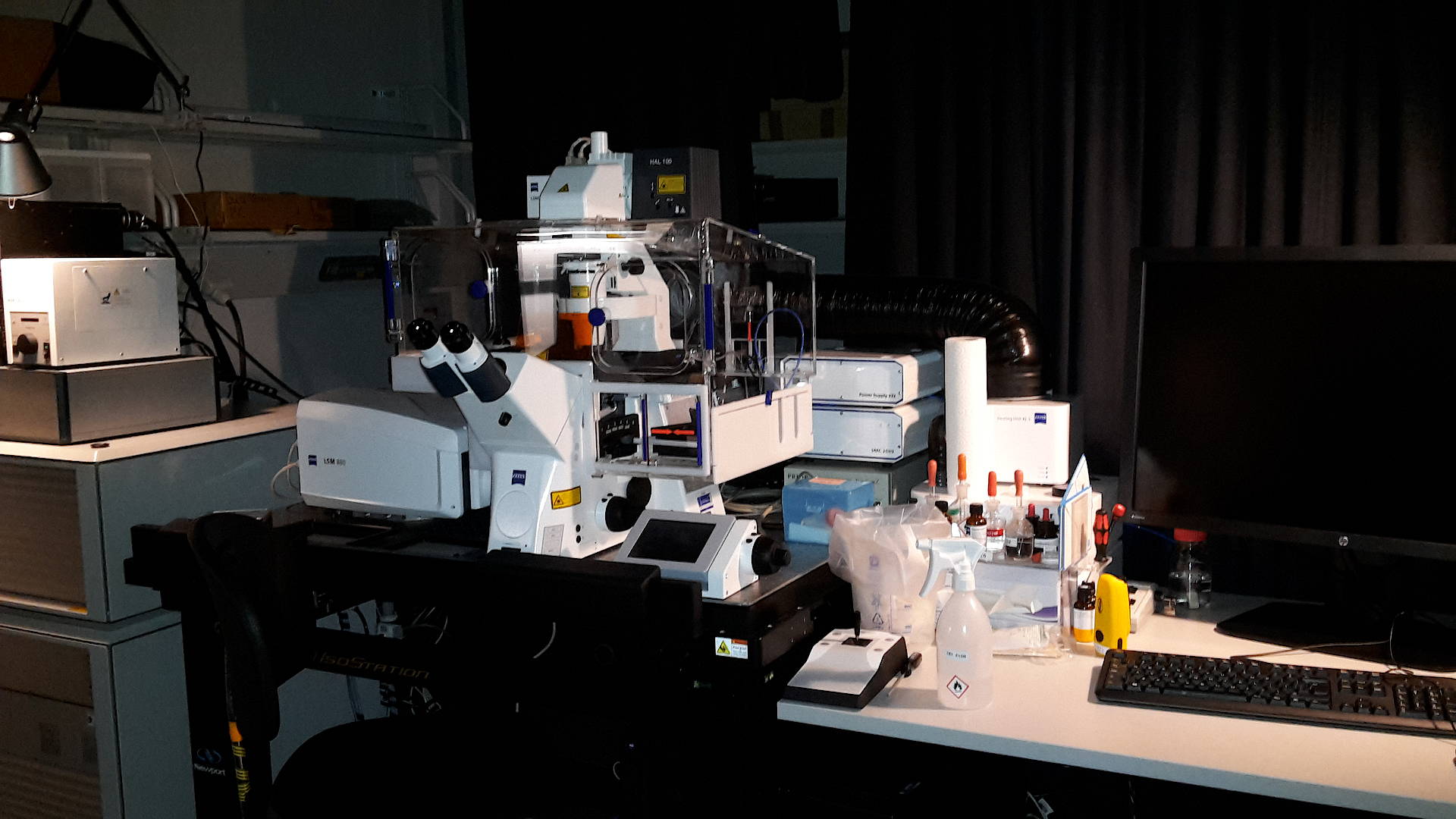 Zeiss LSM 880 inverted single photon point scanning confocal system with Quasar detector (32 spectral detection channels in the GaAsP detector plus 2 PMTs) and transmitted light detector. Airy scan detector for high resolution imaging. Motorized stage for multi-point acquisition.