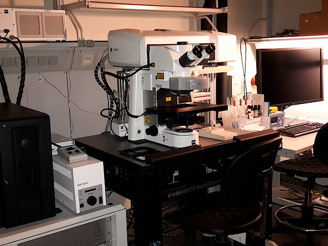 Zeiss LSM 880 upright single photon point scanning confocal system with Quasar detector (32 spectral detection channels in the GaAsP detector plus 2PMTs) and transmitted light detector.