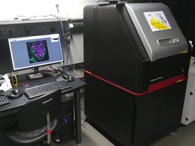 The microscope is equipped with 4x sCMOS cameras, 4 lasers: 405nm, 488nm, 561nm, 642nm, a set of filters suitable for DAPI/GFP/TRITC/CY5, and has photo-manipulation capabilities (FRAP and photo-activation).
