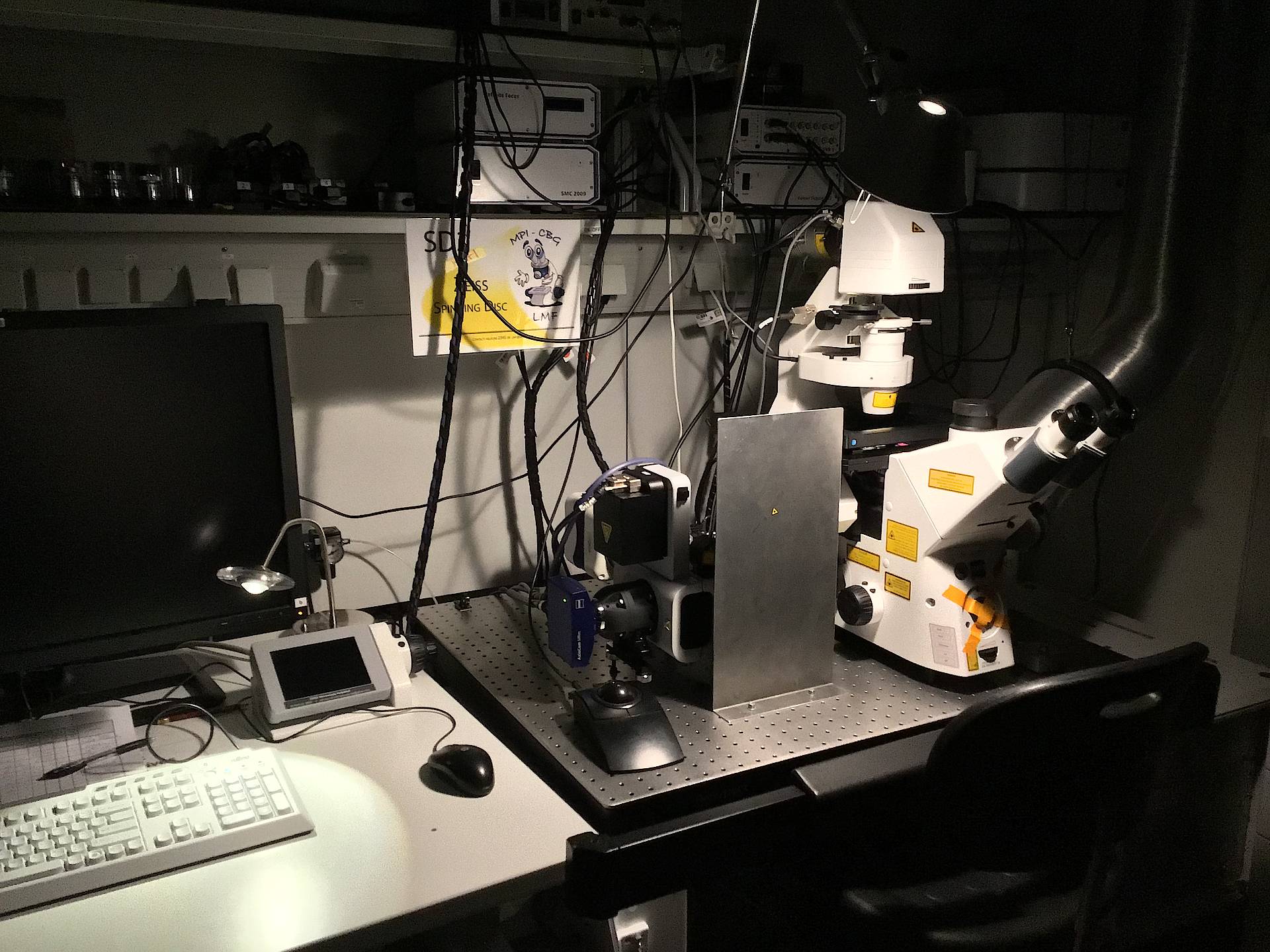 Fast Spinning Disc Confocal (Yokogawa CSU-X1) with DirectFRAP on a Zeiss microscope.The microscope is equiped with two cameras.