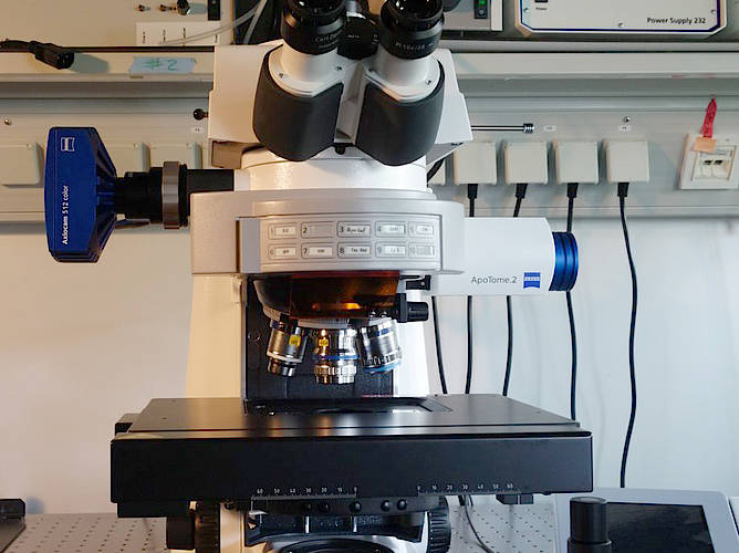 Research-grade upright widefield microscope equipped with a motorized stage and an ApoTome.2 for improved z-contrast. The system features two cameras: one color camera for Brightfield imaging of e.g. histological samples and one B/W camera for Differential Interference Contrast (DIC), Darkfield and Fluorescence imaging.