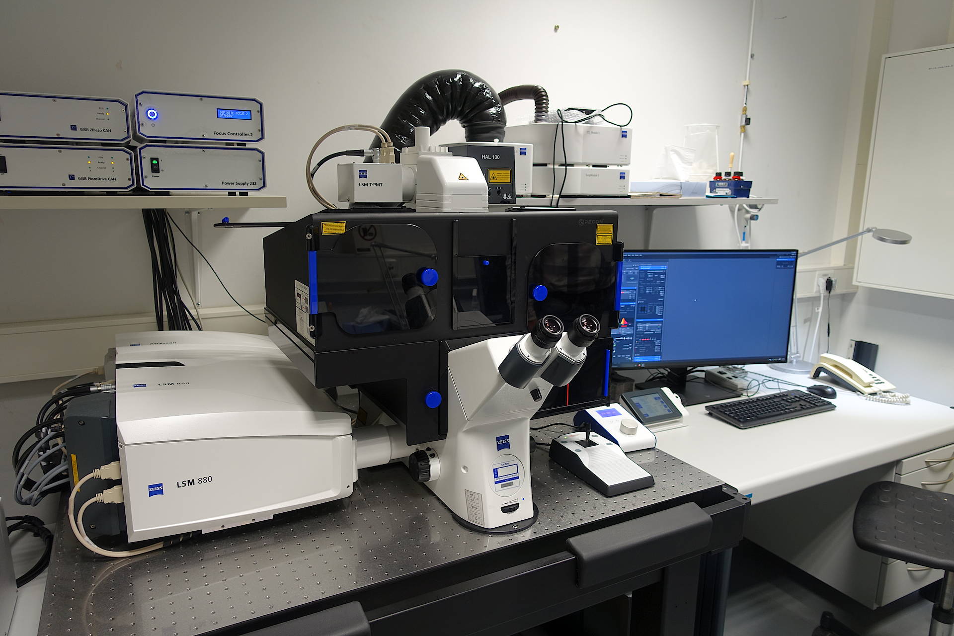 The Zeiss LSM 880 confocal laserscanning microscope is the newest generation of confocal systems. The sensitivity, resolution and speed allow to work on even weak signals or to obtain small or fast processes. The system ist equiped with a setup for live cell imaging and with the special Airyscan detector which gives you a resoluition down to 120nm laterally and 350nm axially. The fast scanner as well as the spectral detector complete this system to a multifunctional microscope. The laser lines are well distributed over the spectrum and the microscope is also capable for brightfield.