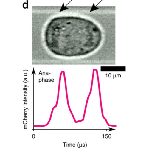 The throughput of cell mechanical characterization has recently approached that of conventional flow cytometers. However, this very sensitive, label-free approach still lacks the specificity of molecular markers. Here we developed an approach that combines real-time 1D-imaging fluorescence and deformability cytometry in one instrument (RT-FDC), thus opening many new research avenues. We demonstrated its utility by using subcellular fluorescence localization to identify mitotic cells and test for mechanical changes in those cells in an RNA interference screen.